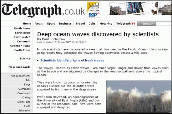 نشرت جريدة تيلي غراف في 13/12/2007 مقالاً بعنوان: "العلماء يكتشفون الأمواج العميقة في المحيط" Deep ocean waves